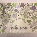 מפית לכיסוי החלות לשולחן השבת, עשויה בד סאטן איכותי ומעוטרת בפסוקים המייחדים את השבת הכתובים בדרך מיוחדת – אומנות הכתיבה הקישוטית.